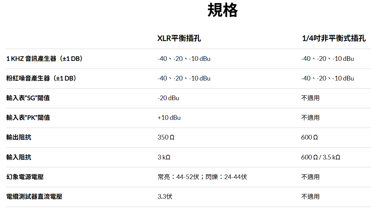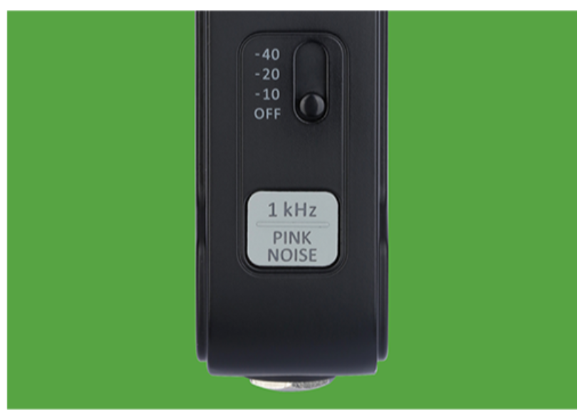 透過 XLR 公頭、1/4″ 和 1/8″ 連接器輸出 1 kHz 正弦波或粉紅噪音音訊訊號,並提供三種輸出電平選項:-10 dB、-20 dB 和 -40 dB。