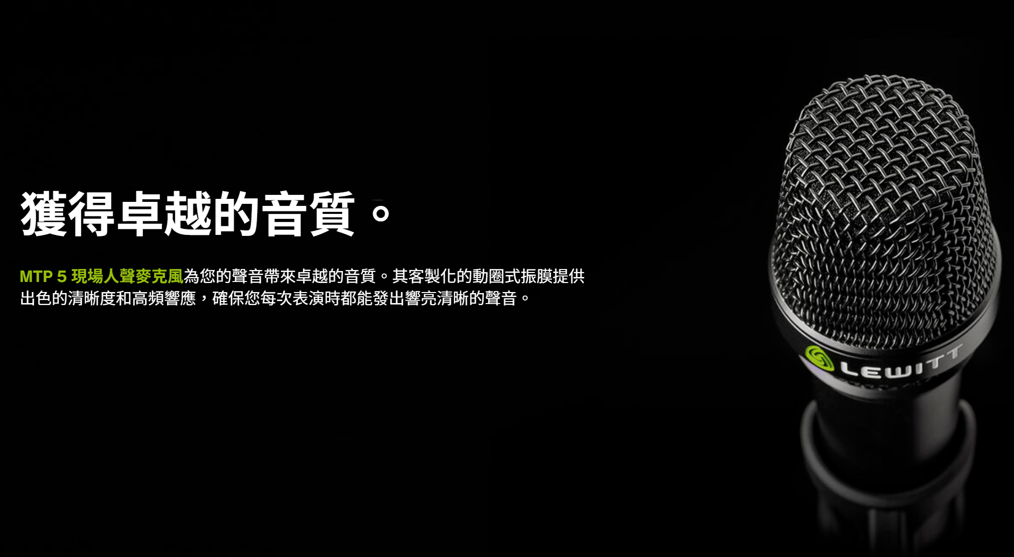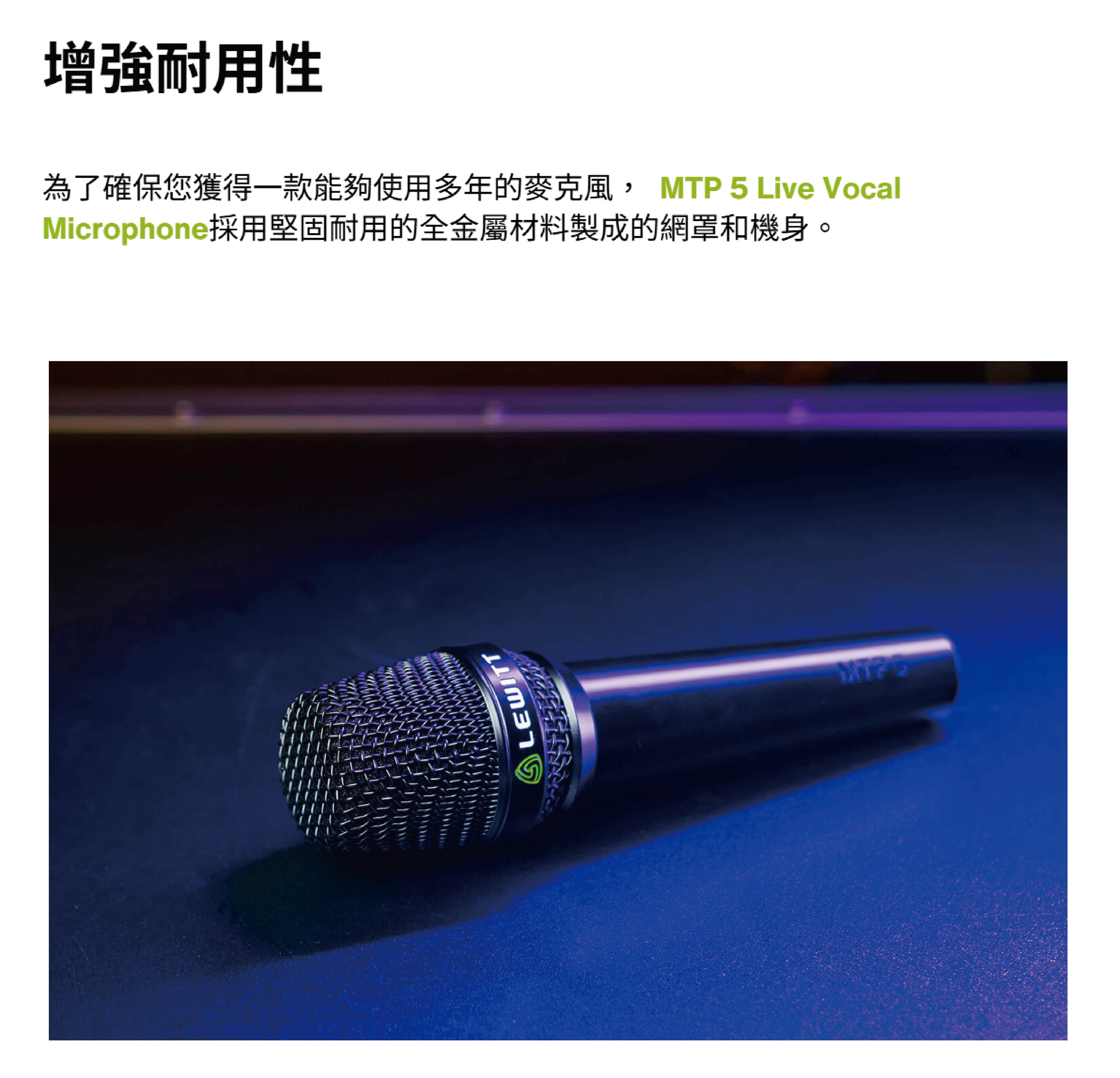 LEWITT MTP-5S 是一支專為現場演出打造的動圈式人聲麥克風,以卓越的音質表現、強健的全金屬結構、以及出色的防嘯叫能力,在舞台麥克風市場中樹立全新標竿。無論是演唱會、戶外活動、教堂音響或脫口秀,MTP-5S 都能精確傳遞人聲的清晰度與層次感,讓你的聲音在任何演出場合都清楚突出。