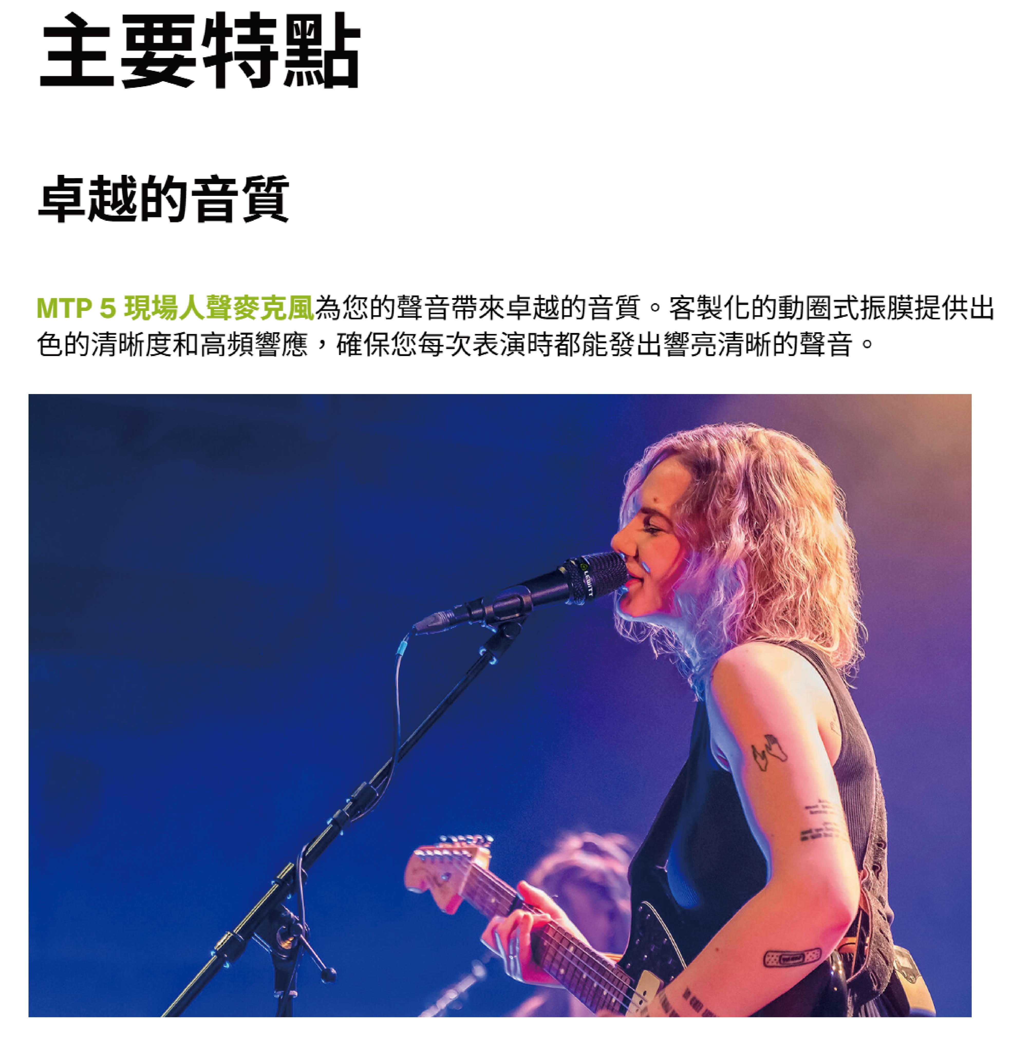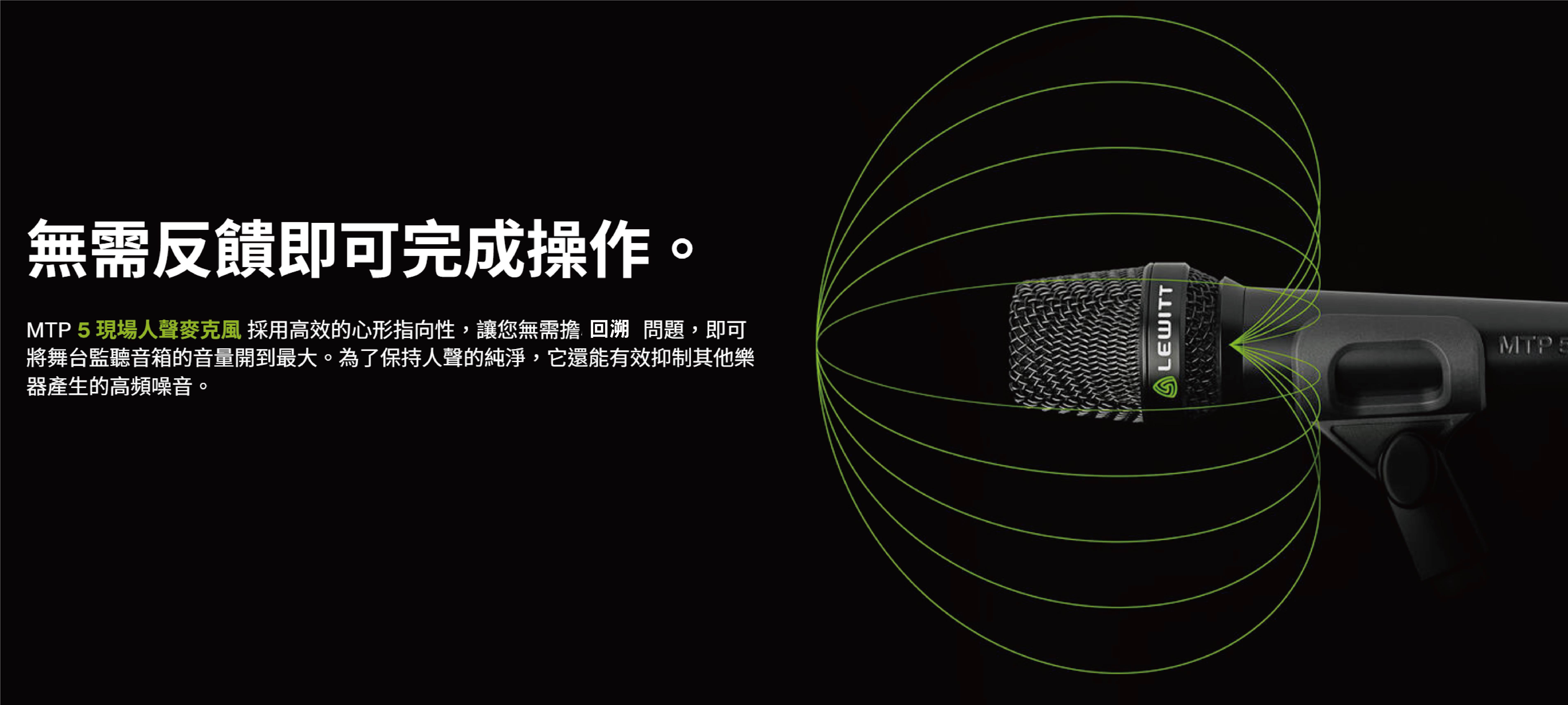 MTP-5S 採用客製化動圈振膜,專為人聲頻率響應優化,提供清晰而自然的高頻延伸,讓咬字和氣息細節完整呈現。心型指向模式對側面與背面的聲音有強力的抑制效果,即使舞台監聽喇叭開得很大,也能將嘯叫的發生風險降至最低,讓演出人員可以放心大聲演唱,無需擔心回授問題。