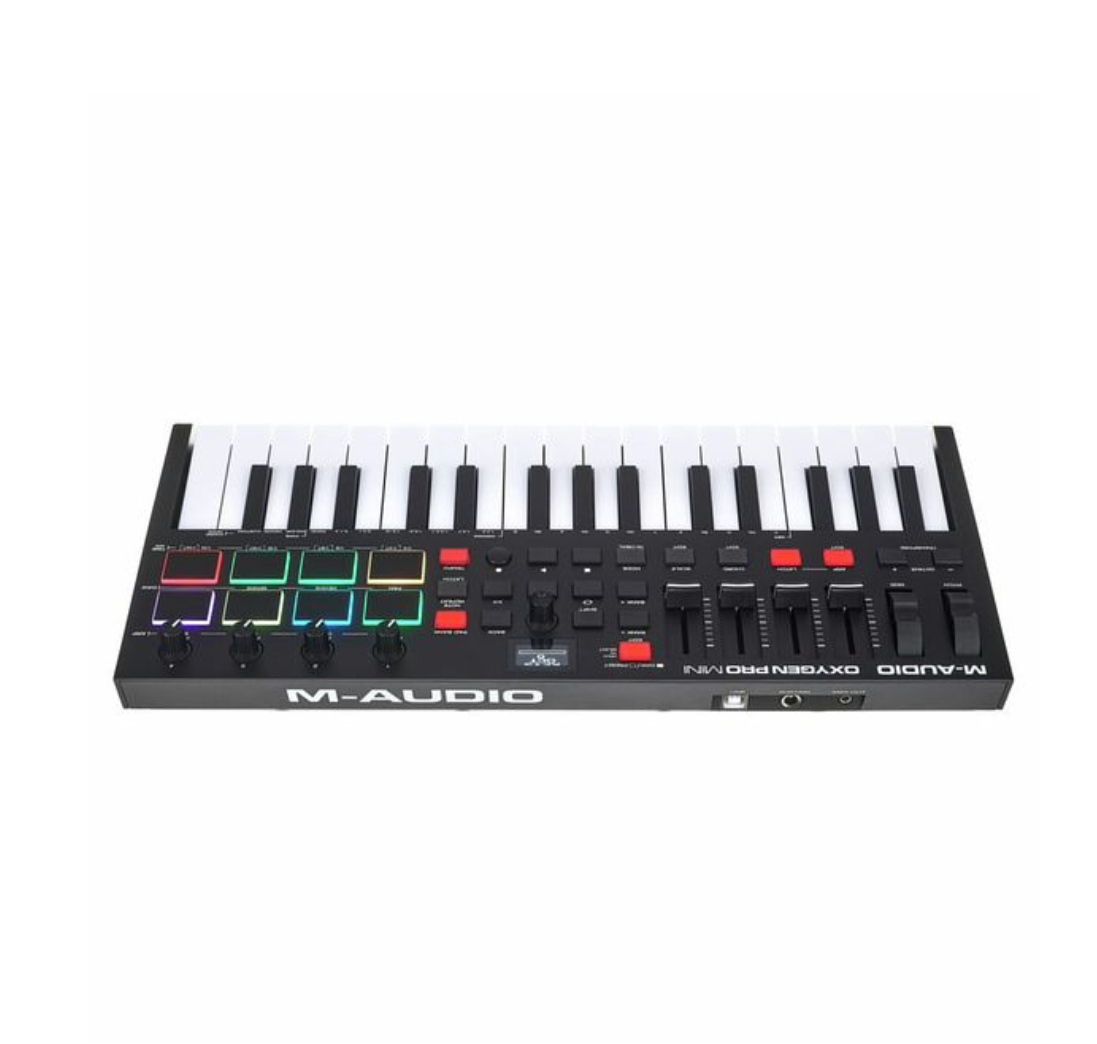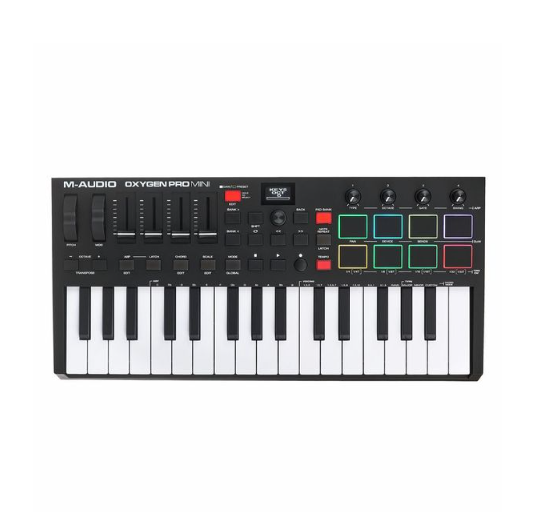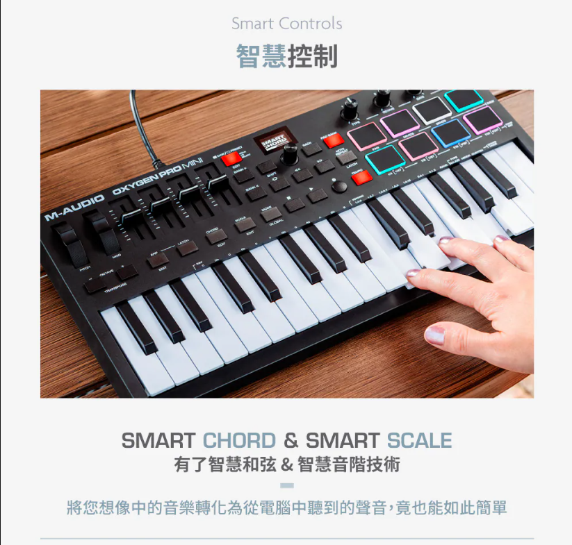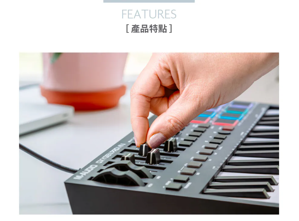 M-AUDIO OXYGEN PRO MINI 主控鍵盤,擁有強悍規格的 8 個力度感應打擊墊及 RGB 原彩顯示,更有播放鍵、停止鍵、錄音鍵,可以快速的控制軟體介面,除此之外,更支援延音踏板控制器以及快速選單,可以讓我們快速的在編曲軟體中選擇音色以及軌道。