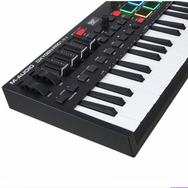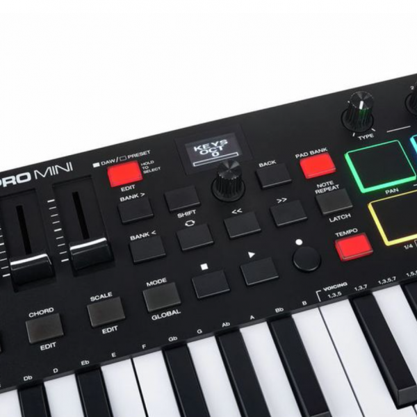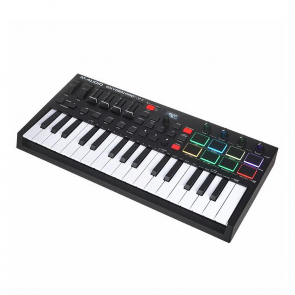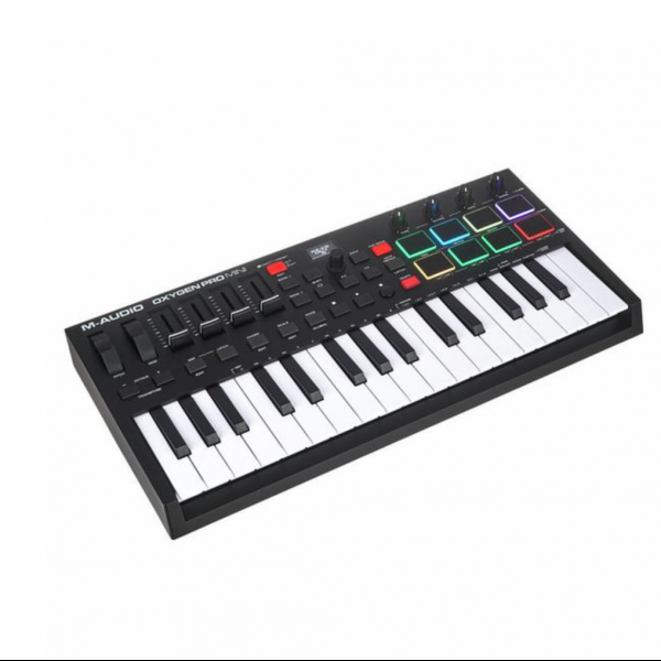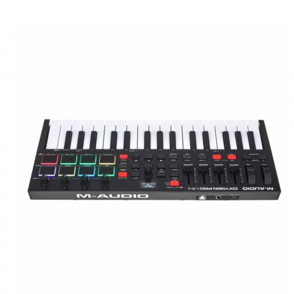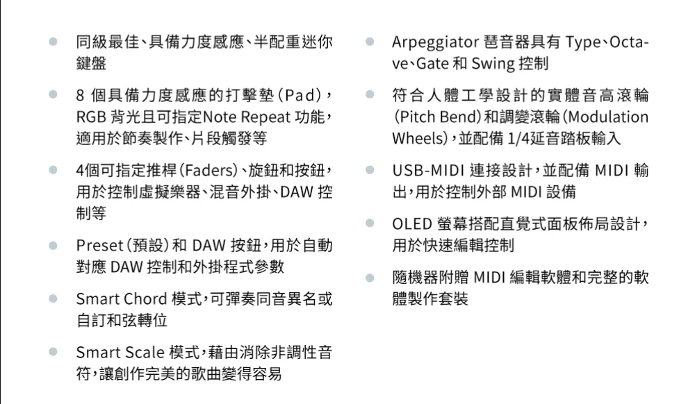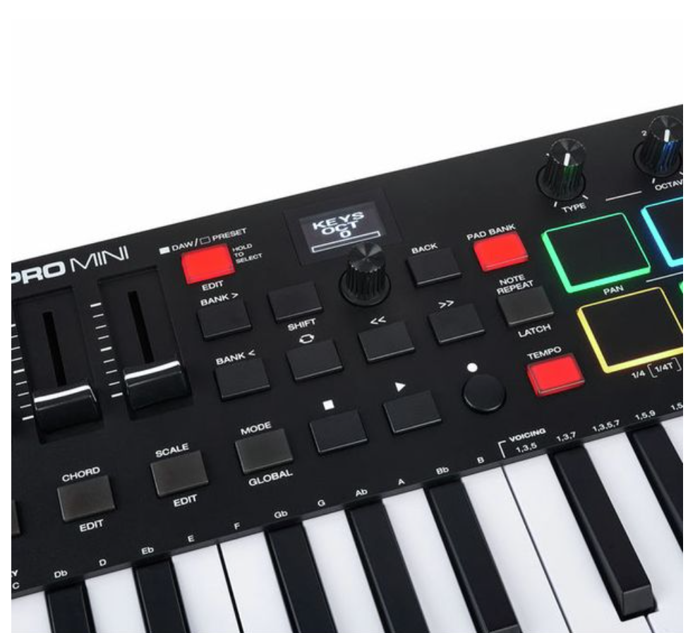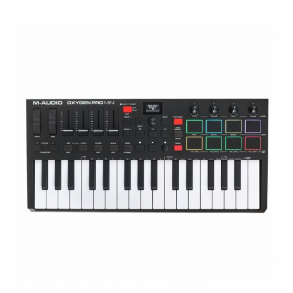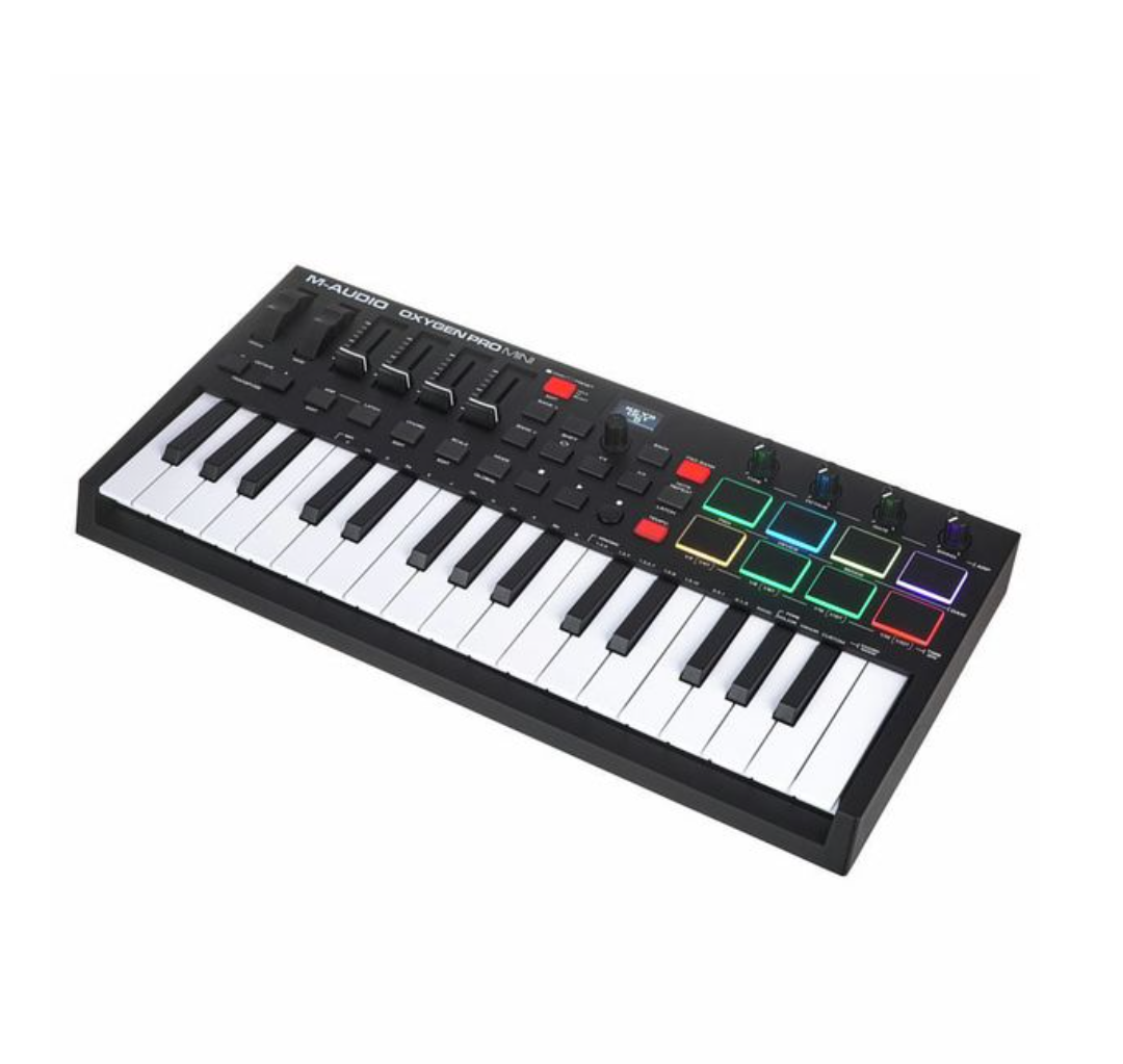 M-AUDIO OXYGEN PRO MINI 主控鍵盤,擁有強悍規格的 8 個力度感應打擊墊及 RGB 原彩顯示,更有播放鍵、停止鍵、錄音鍵,可以快速的控制軟體介面,除此之外,更支援延音踏板控制器以及快速選單,可以讓我們快速的在編曲軟體中選擇音色以及軌道。