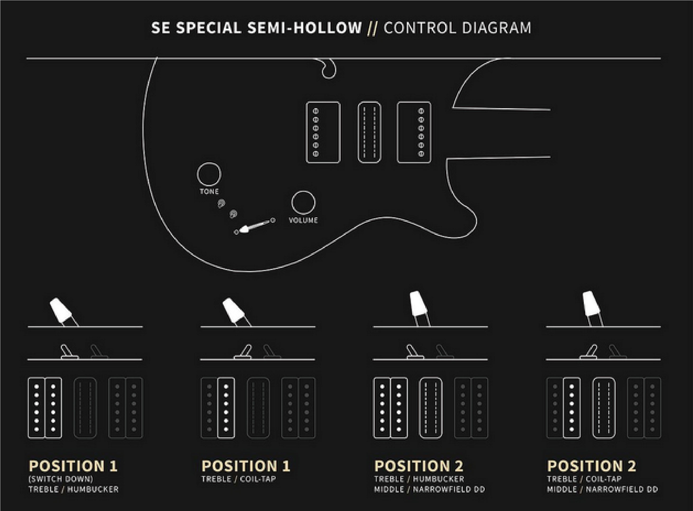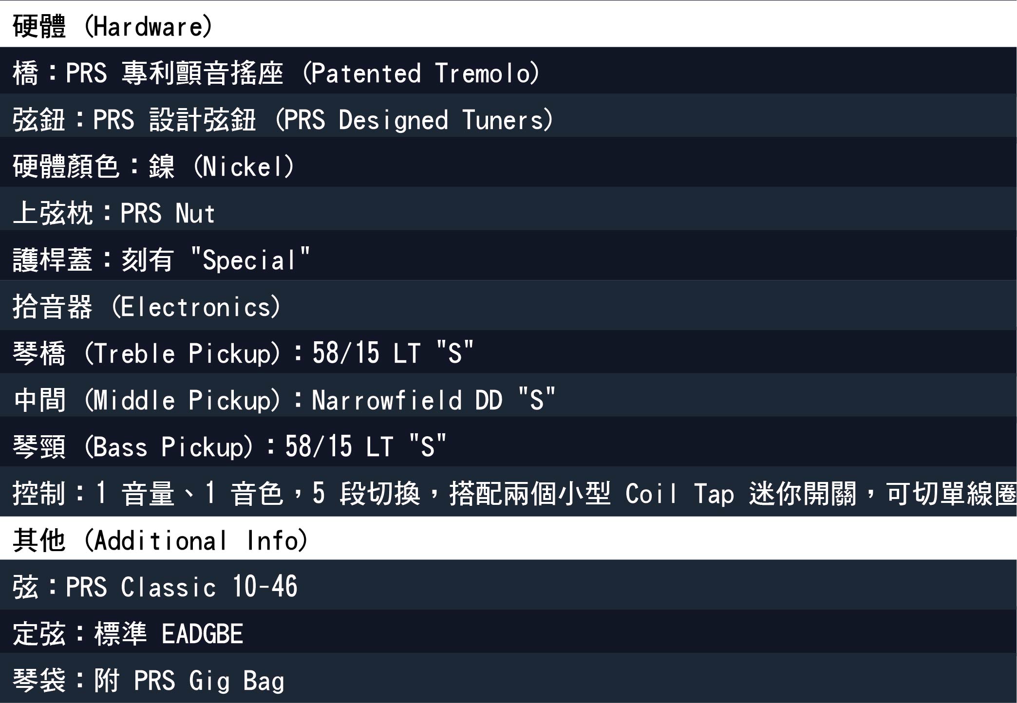 配置方面,SE Special Semi-Hollow 採用 一對 58/15 LT “S” 雙線圈,中段搭載 PRS Narrowfield DD “S”,再加上 Coil-Tap 功能,能輕鬆切換溫暖厚實的 Humbucker 音色與清亮脆爽的 Single-coil 音色。這樣的三拾音器組合提供獨特的音色選擇,涵蓋從爵士、藍調到搖滾的多種風格。