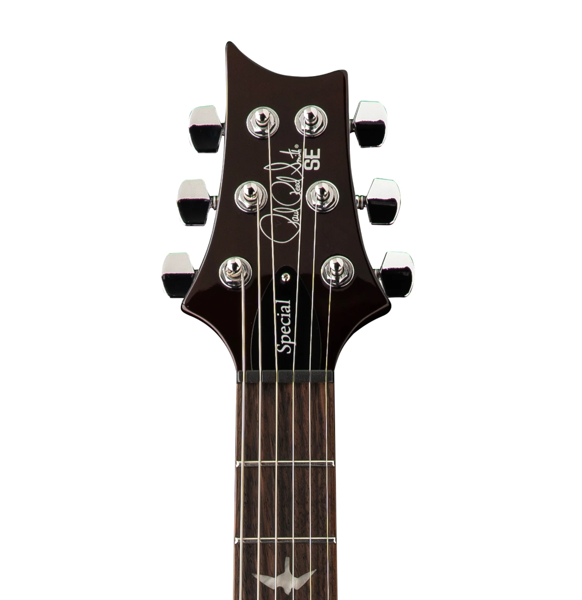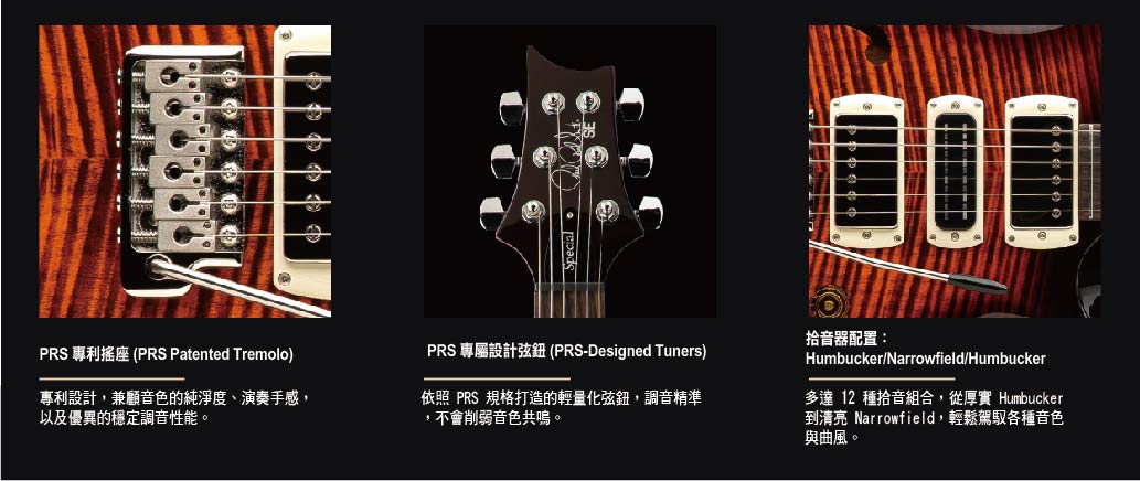 琴頸採用 22 格、25 吋弦長楓木,搭配 玫瑰木指板與 PRS 經典鳥形鑲嵌,演奏手感順暢,外觀也極具標誌性。最後配備 PRS 設計弦鈕與 專利搖桿橋 (Tremolo Bridge),確保穩定的調音與高度表現力。