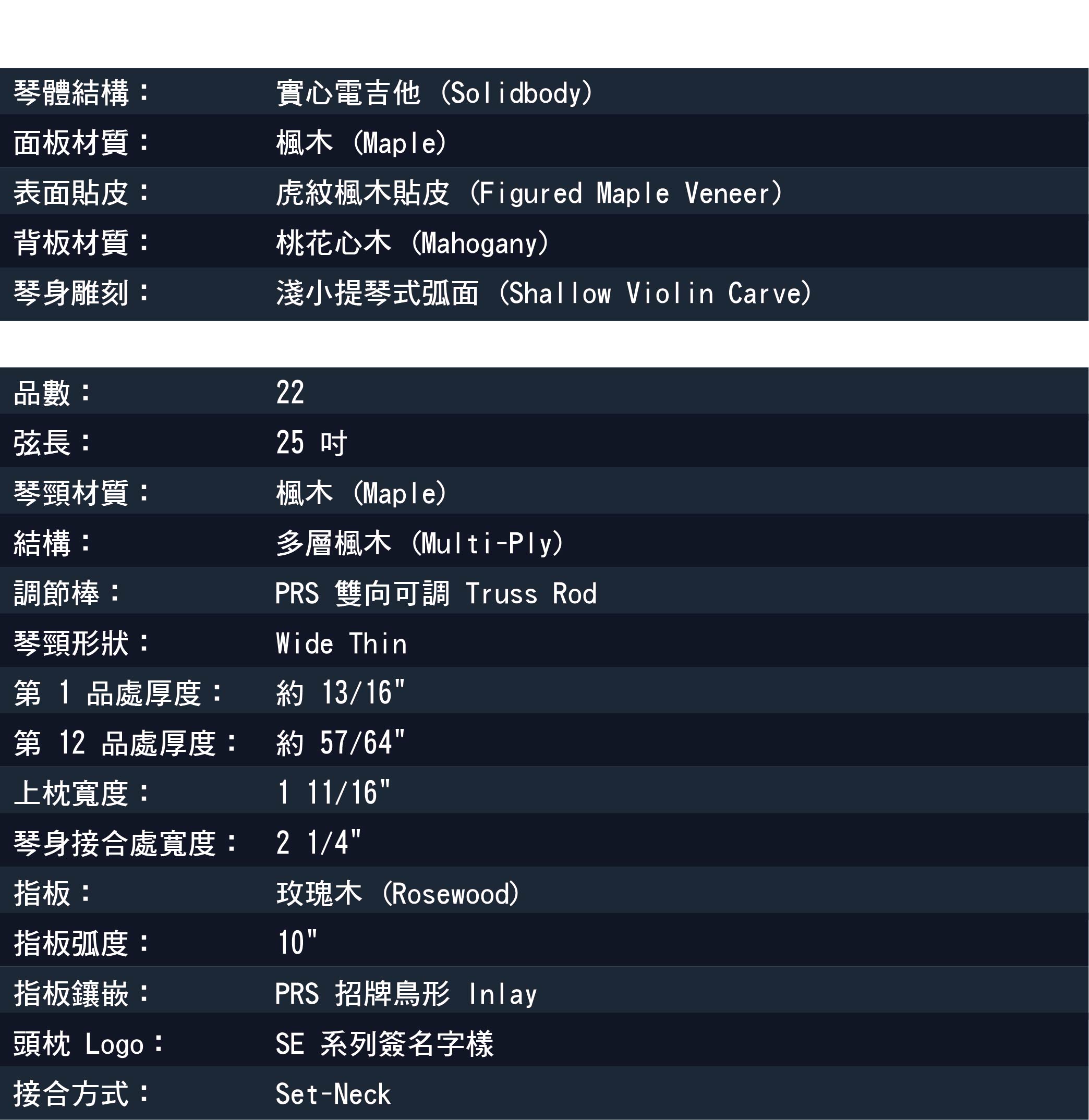琴頸採用 22 格、25 吋弦長的楓木 Wide Thin 規格,手感舒適且具掌控感;玫瑰木指板搭配 PRS 經典 鳥形鑲嵌,增添優雅質感。配備 PRS 設計弦鈕與 專利搖桿橋 (Tremolo Bridge),保證穩定的音準與高度表現力。