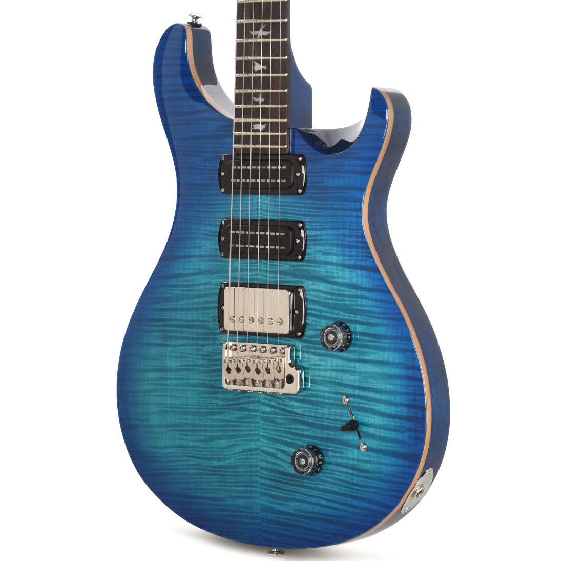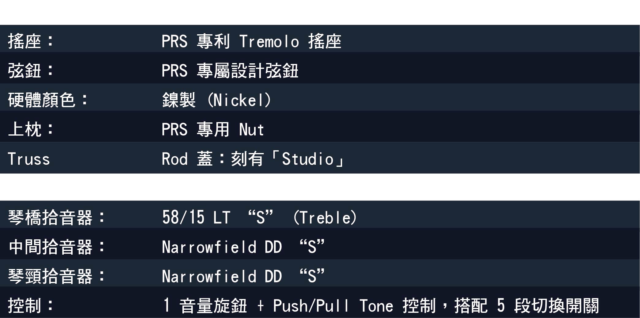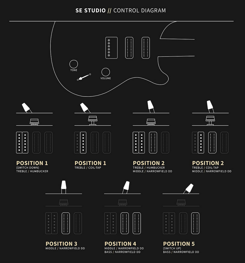 琴身採用 桃花心木背板搭配楓木面板,音色溫暖又具穿透力。拾音器配置為 單 / 單 / 雙 (S/S/H):前段與中段搭載 PRS Narrowfield DD “S”,後段則是 PRS 58/15 LT “S” 雙線圈。這樣的組合能帶來寬廣的音色範圍,從厚實溫暖的 Humbucker,到清亮通透的 Single-coil,再到介於兩者之間的變化,都能一手掌握。加上 5 段切換開關與 Push/Pull 音色控制,讓 SE Studio 成為能勝任各種曲風的音色變色龍。