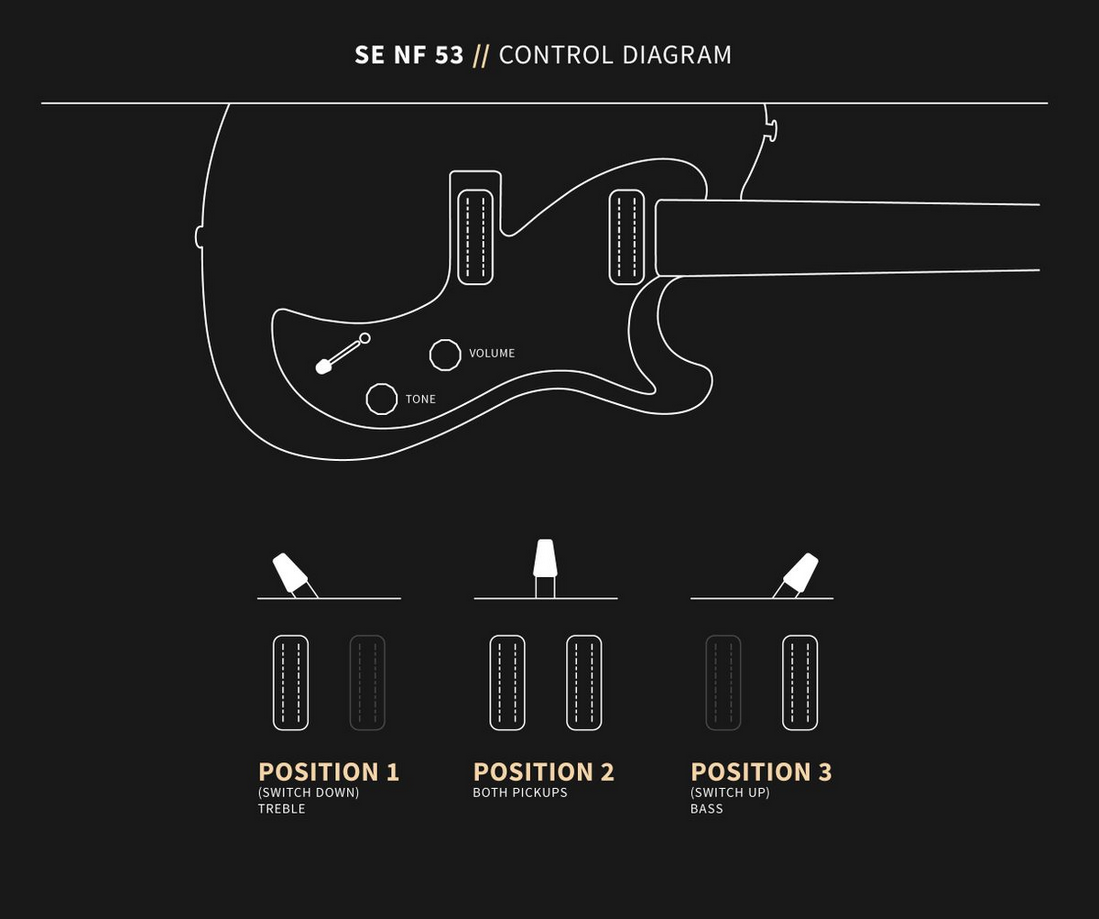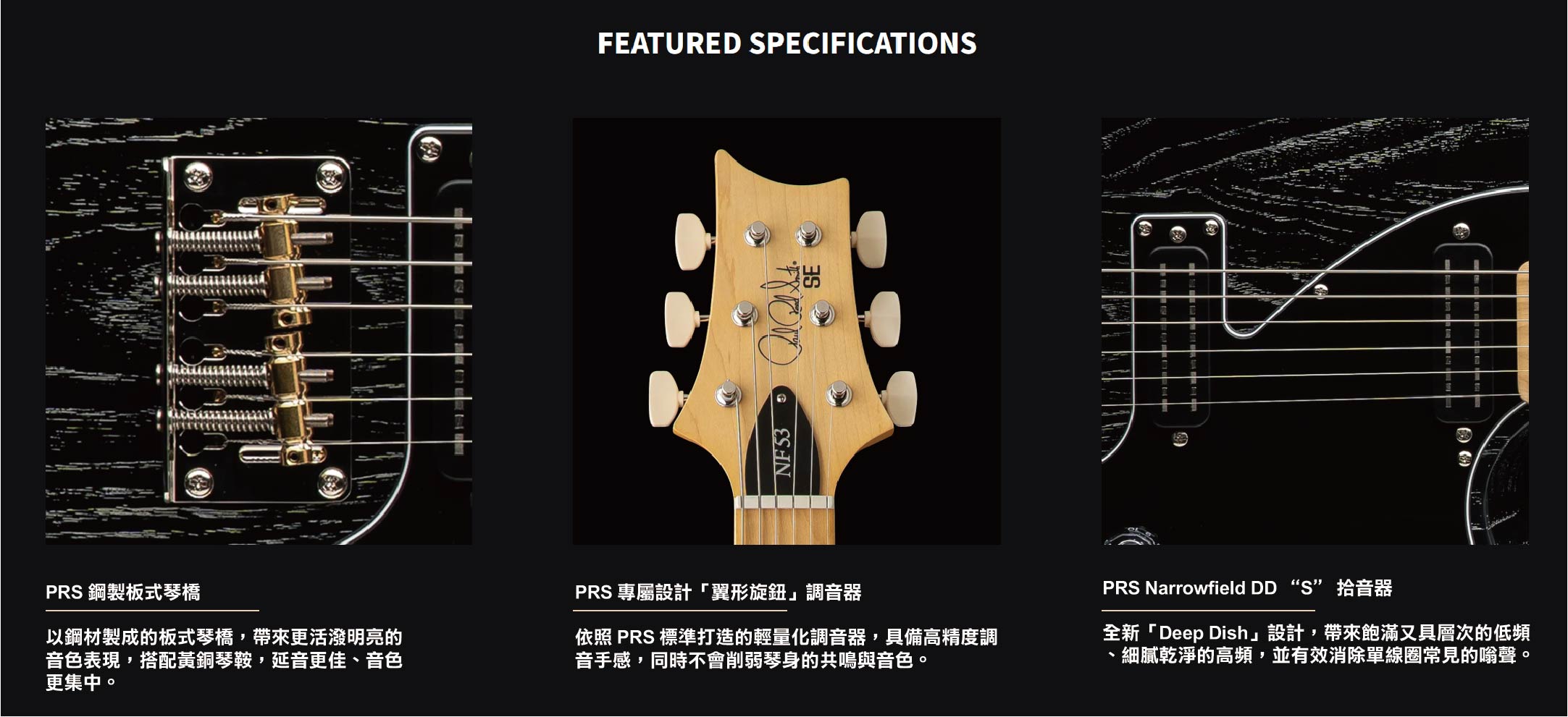 搭配 音量、音色旋鈕與 三段式切換開關,玩家能輕鬆調出理想音色。最後,採用 鋼製琴橋搭配黃銅桶型弦鈕,讓 PRS SE NF 53 的音色更活潑、共鳴更強烈。