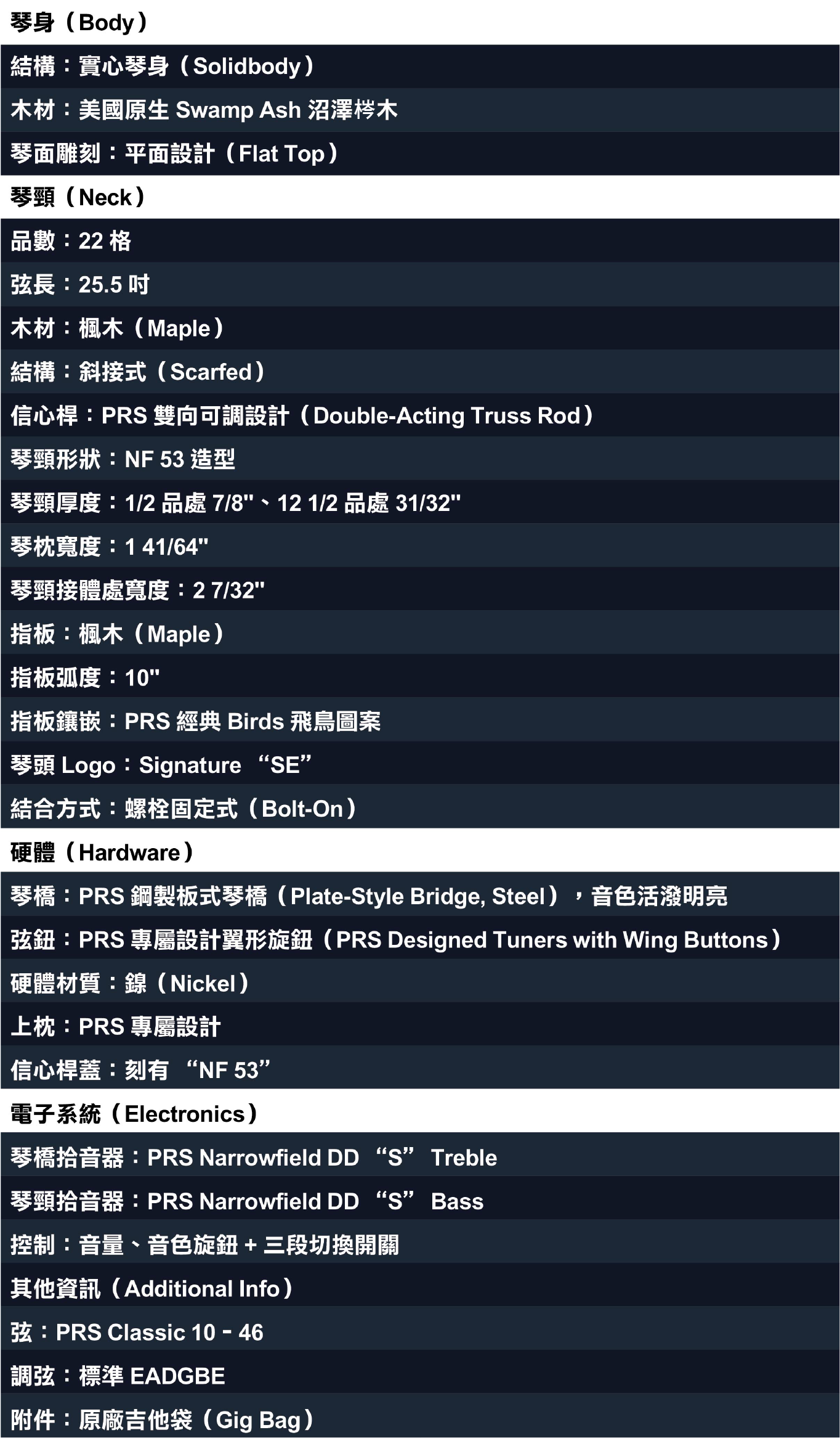 PRS SE NF 53 是一把現代卻蘊含經典氣質的強力電吉他。以 美洲沼澤梣木琴身為基礎,搭配 22 格、25.5 吋弦長的楓木螺栓式琴頸與指板,展現最純粹、最經典的電吉他精神。再加上 PRS Narrowfield DD “S” 拾音器,帶來強勁、音樂性豐富且無雜訊的音色,讓這把琴散發獨特的 PRS 風格。