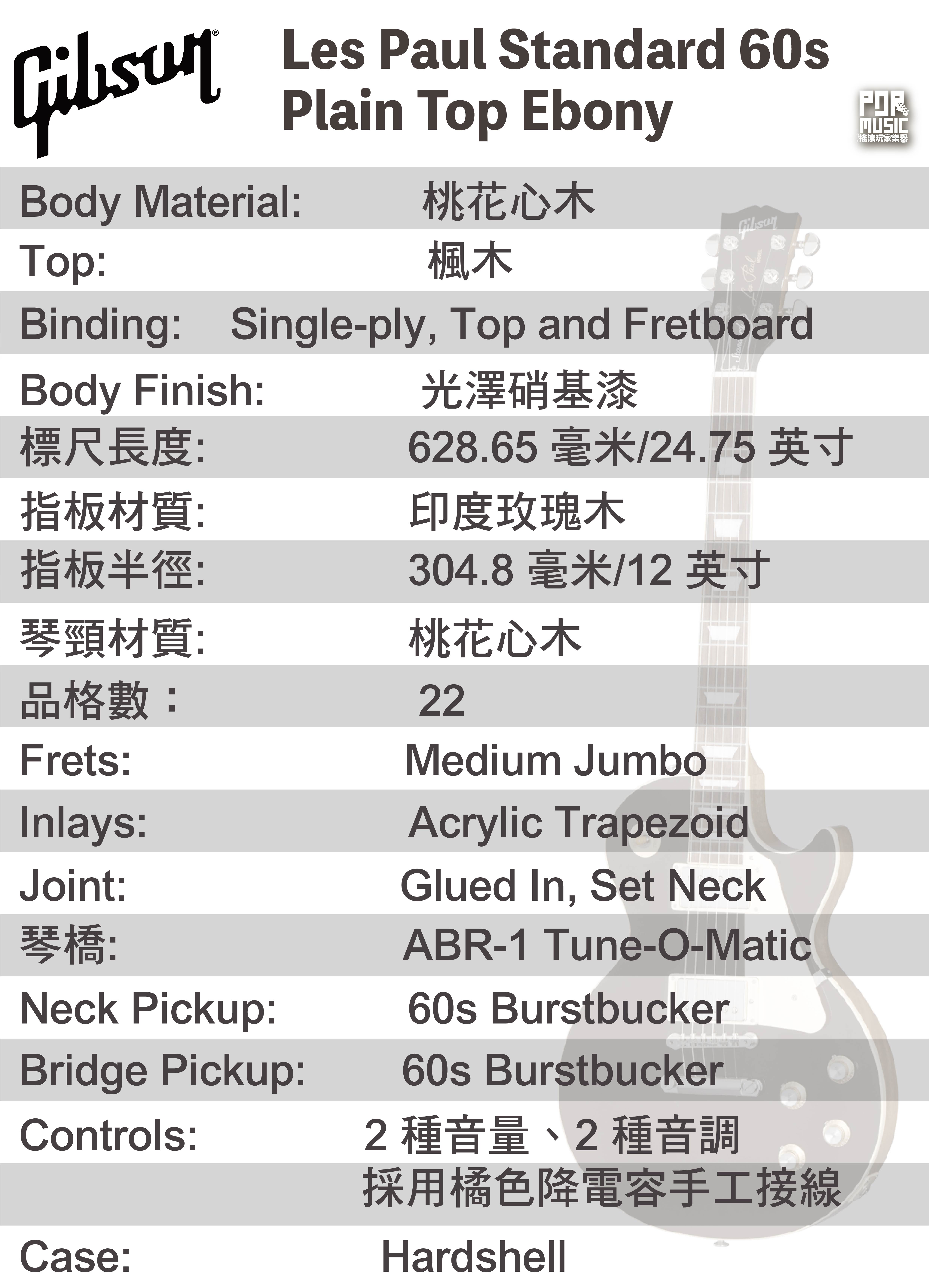 全新 Les Paul™ Standard 60s Plain Top 回歸經典設計,使其具有相關性、可演奏性和受喜愛性 - 塑造跨代和音樂流派的聲音。它向 Gibson 的創新黃金時代致敬,讓真實性重新煥發活力。 Les Paul Standard 60s 純色面板採用實心桃花心木琴體和純楓木面板。桃花心木琴頸具有 60 年代風格的 SlimTaper™ 輪廓和帶有梯形鑲嵌的紅木指板。它配備了經典的 ABR-1 Tune-O-Matic™ 琴馬、鋁製 Stop Bar 拉弦板、Grover® Rotomatic® “腎型”調音器以及帶有銀色反光鏡的金色禮帽旋鈕。 60 年代的 Burstbucker™ 拾音器裝有 Alnico 5 磁鐵,並連接到音頻錐度電位器和 Orange Drop® 電容器。現在提供引人注目的客製化顏色,一定會引人注目,還包括一個硬殼盒。
