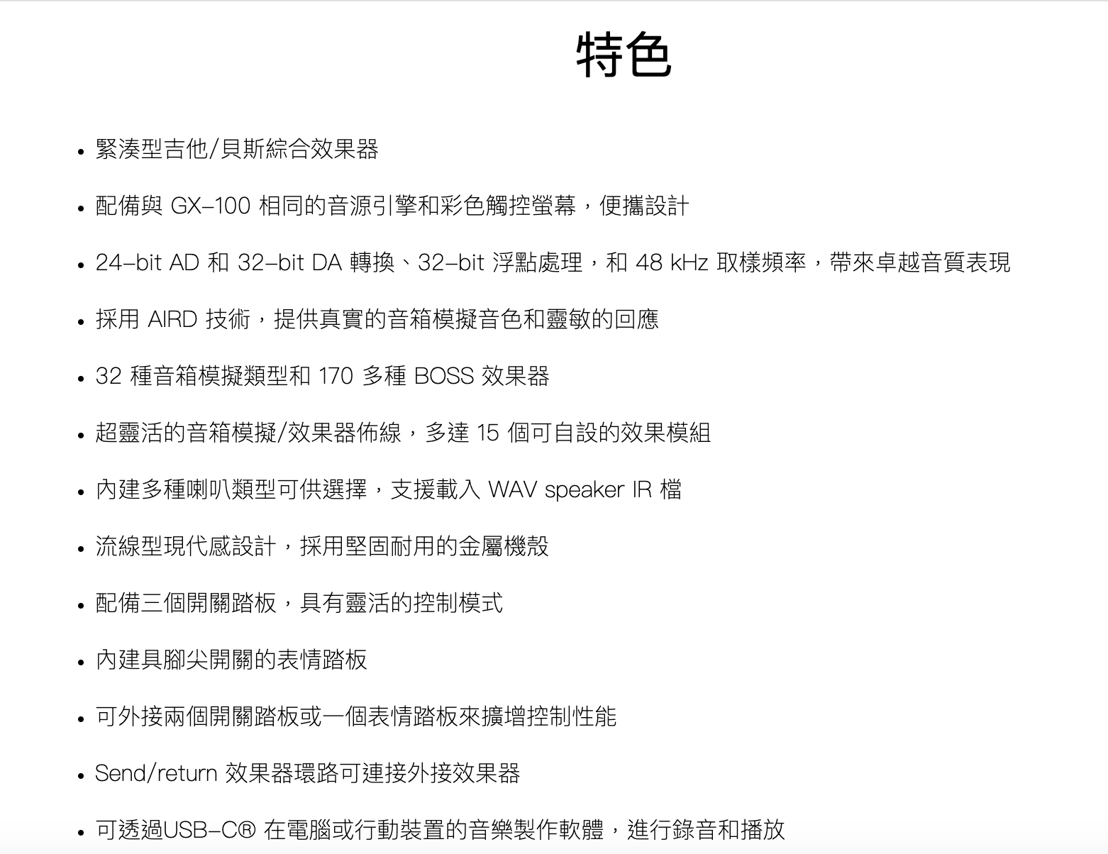 世界各地的樂手都喜愛 GX-100 流線俐落的設計、流暢的操作介面,和高品質音色。輕巧的 GX-10 配備了與 GX-100 相同的核心引擎,將令人振奮的相同音色體驗,融入到更便攜設計當中。讓您擁有涵蓋多種音樂風格的多種 AIRD 音箱模擬和效果器,透過直覺彩色觸控螢幕和面板旋鈕,可以快速打造想要的音色。多模式的開關踏板、內建表情踏板和 USB 音訊連接功能,讓 GX-10 能夠無縫轉換於舞臺表演、桌面錄音、歌曲創作以及日常練習。