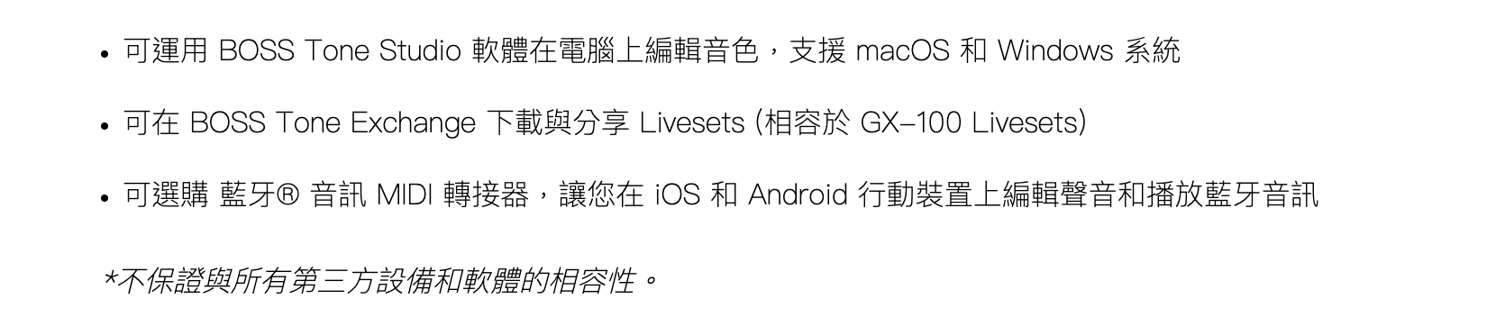 除了編輯音色外,BOSS Tone Studio 可讓您管理 GX-10 音色,組織成適用於不同場次或演奏環境的 Livesets。您可以在 app 內直接進入 BOSS Tone Exchange 並下載專業的音色,並與全球 BOSS 社群分享 GX-10 Liveset。 GX-10 與 GX-100 Livesets 完全相容。內建 USB-C audio 介面,可在電腦和行動裝置的音樂製作軟體中,錄製高品質的吉他音色。