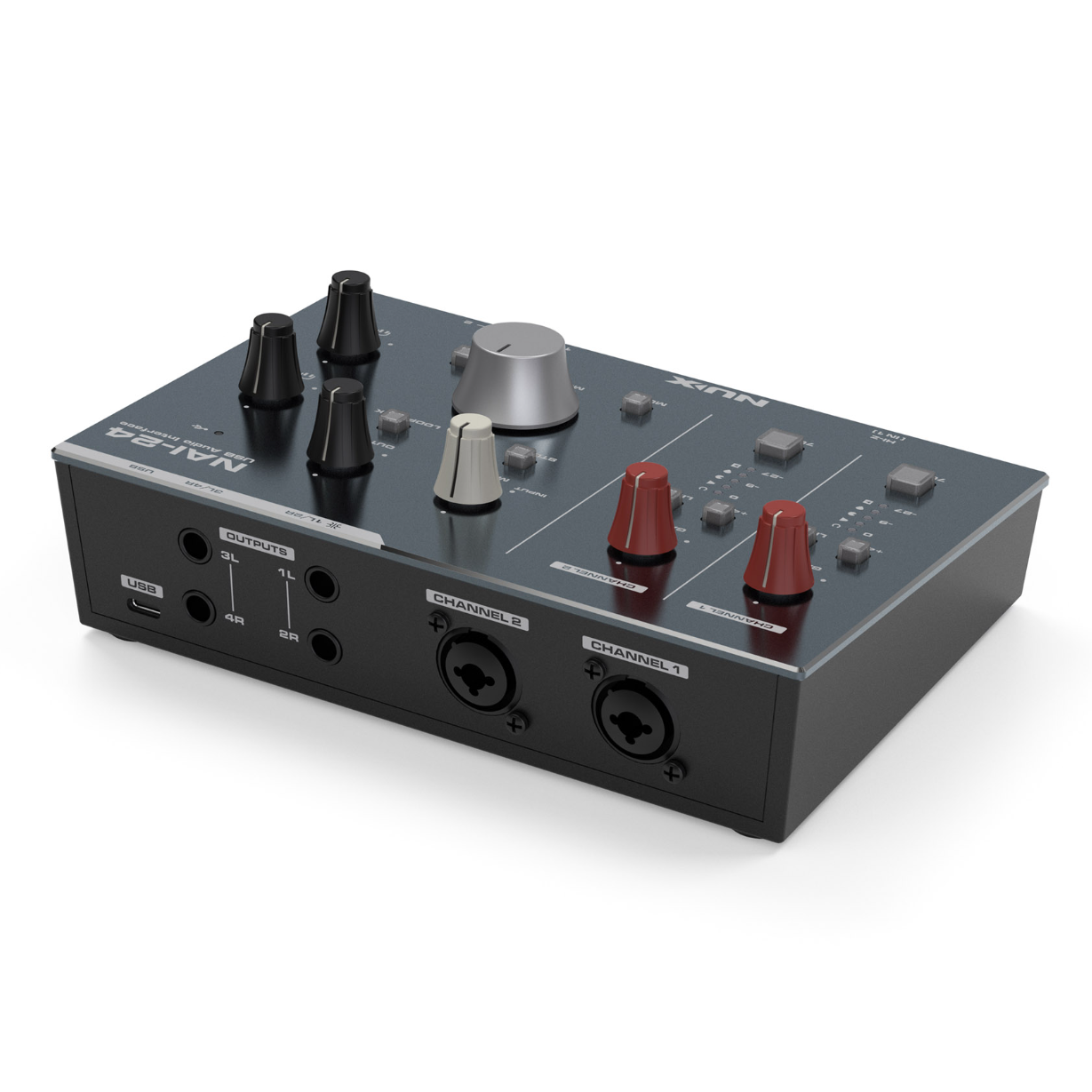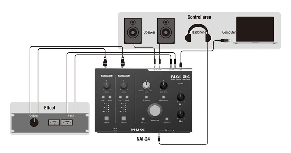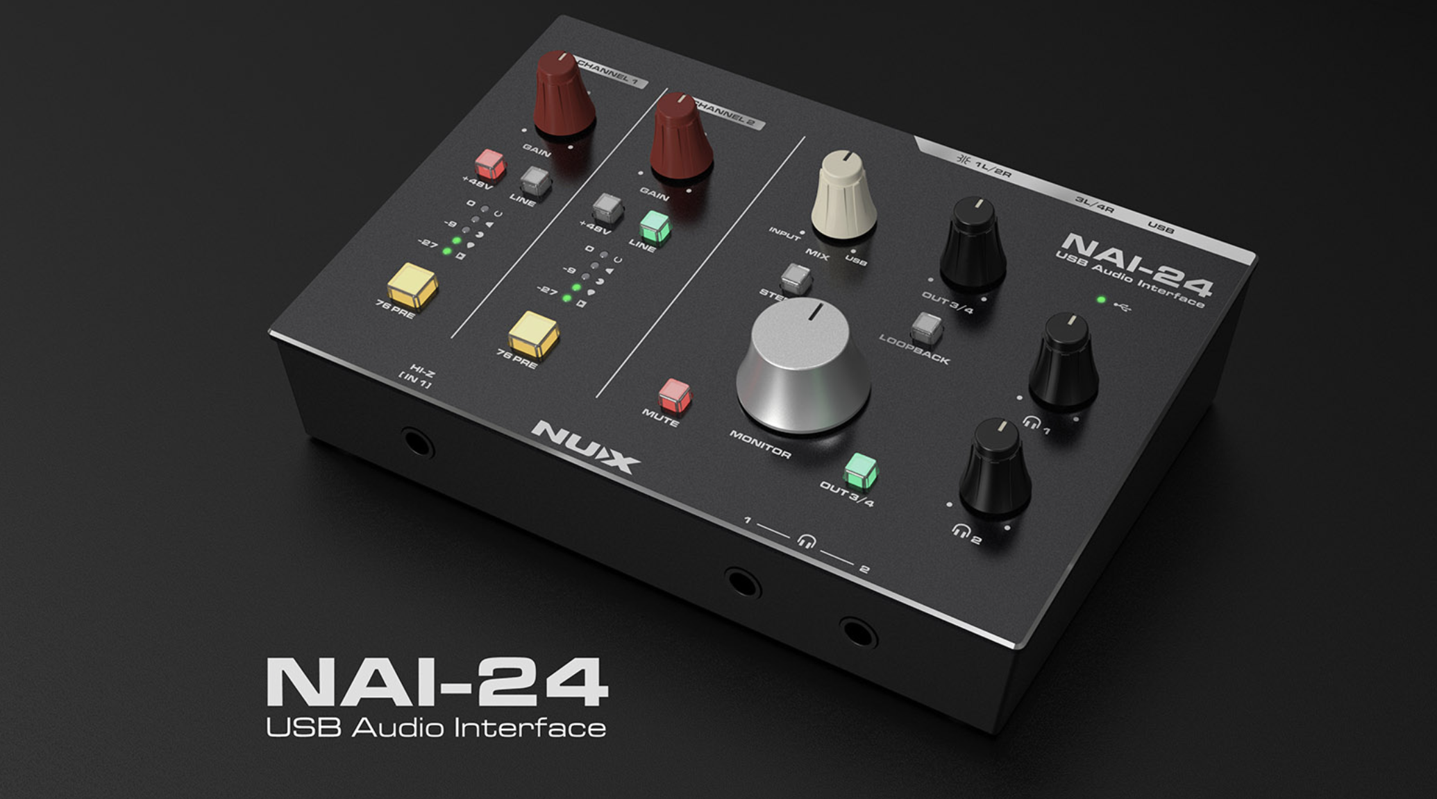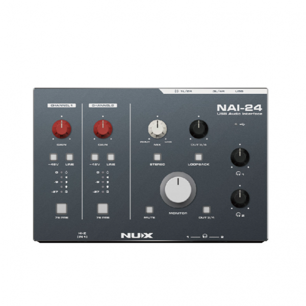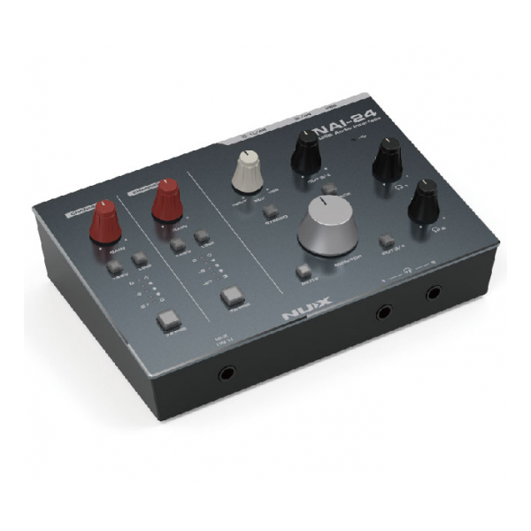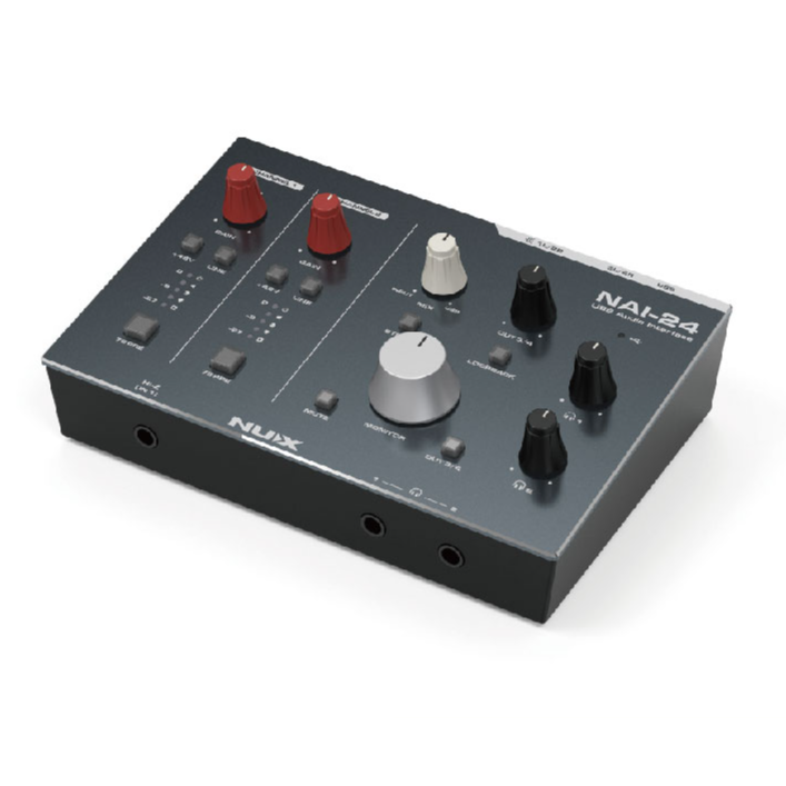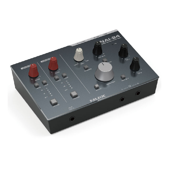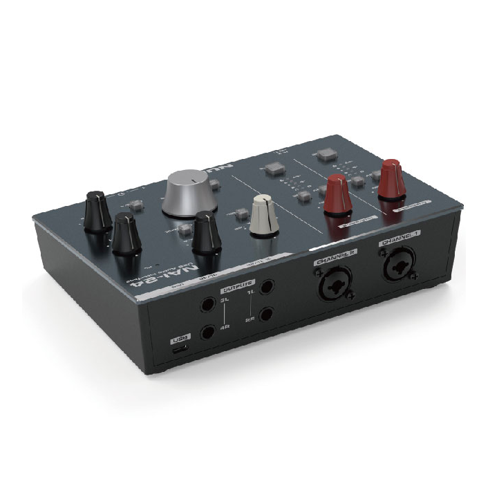 NAI-24是一款人性化的2輸入4輸出音訊接口,提供獨立的48V幻象電源控制和LINE IN切換按鈕。功能包括HI-Z輸入、雙耳機獨立監聽、軟/硬監聽混合調整、一鍵立體聲模式切換、一鍵環回。