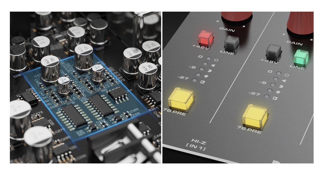 採用FET型76PRE壓縮器電路,採用純硬體電路以獲得更好的音質,並透過數位控制為各種應用提供多種預設模式。