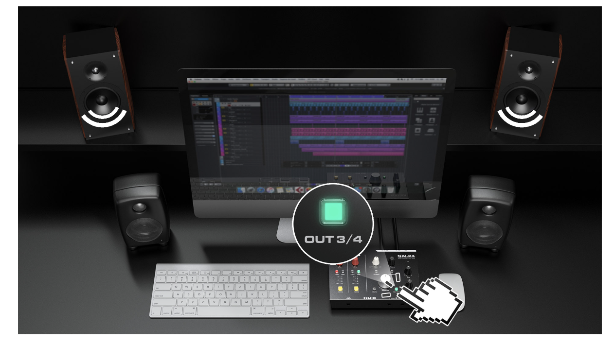 錄音模式:此模式下,使用主頻道(1L/2R)時,按下(OUT3/4)按鈕可一鍵監聽傳送至3/4頻道的聲音。 (例如,音響工程師需要臨時監聽發送給錄音音樂家的曲目。)