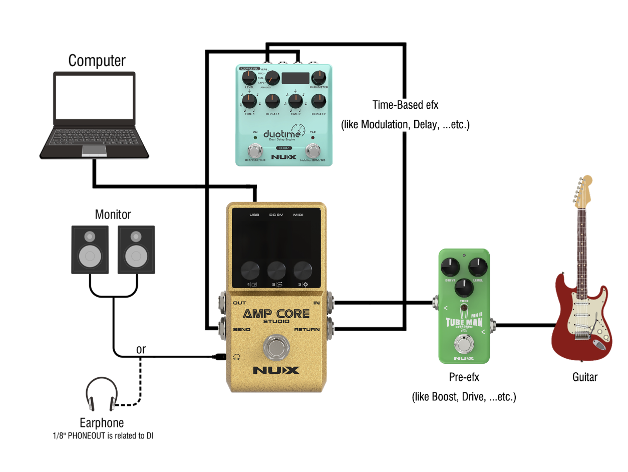 注意:AMP CORE STUDIO 旨在提供擴大器和箱體音色,因此在吉他擴大器前面使用它並不理想。如果您在直接情況下將同一個踏板與擴大機一起使用,請在將踏板與吉他擴大器一起使用時關閉 AMP CORE STUDIO 的 IR。我們建議將 1/4” OUT 連接到擴大機的功率擴大機輸入/返回。將 IR 訊號與主動 FRFR 揚聲器或 PA 系統的 DI OUT 連接。
