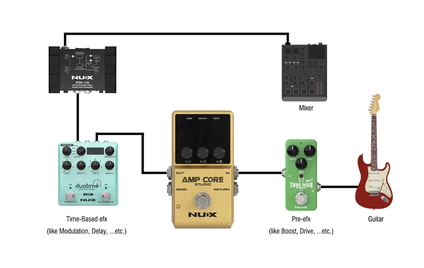 將 AMP CORE STUDIO 添加到任何踏板鏈並連接到混音器或 PA 系統,在現場表演期間實現出色的音調、控制和靈活性。