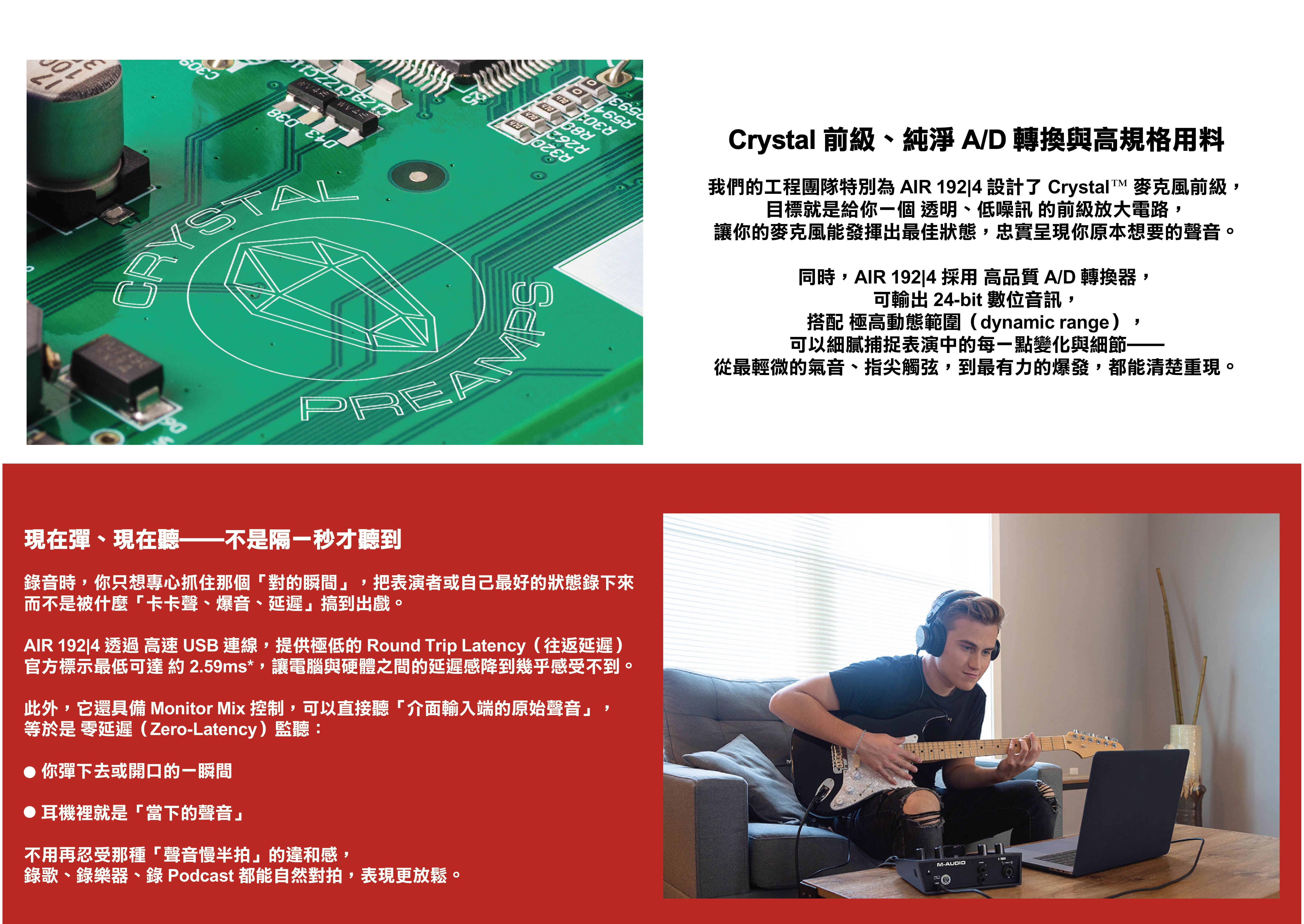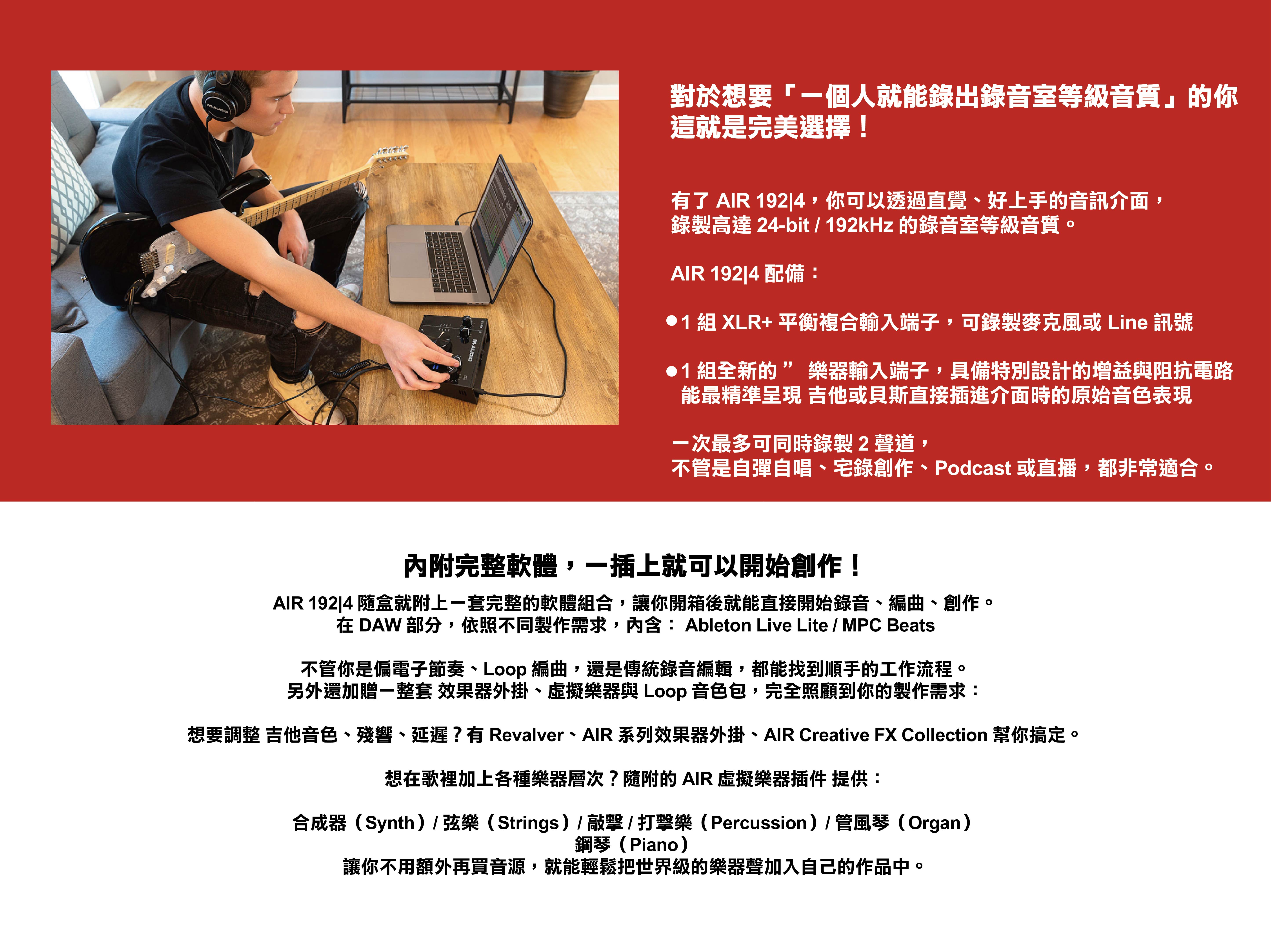 M-Audio 新一代錄音介面 AIR 192|4,是上一代 M-Track 系列升級版,為一款兩進兩出的錄音介面,共有一個麥克風/ 樂器兩用輸入,及一個高阻抗樂器輸入,可同時錄製樂器及人聲,適合樂手、歌手及直播主、Youtuber 使用