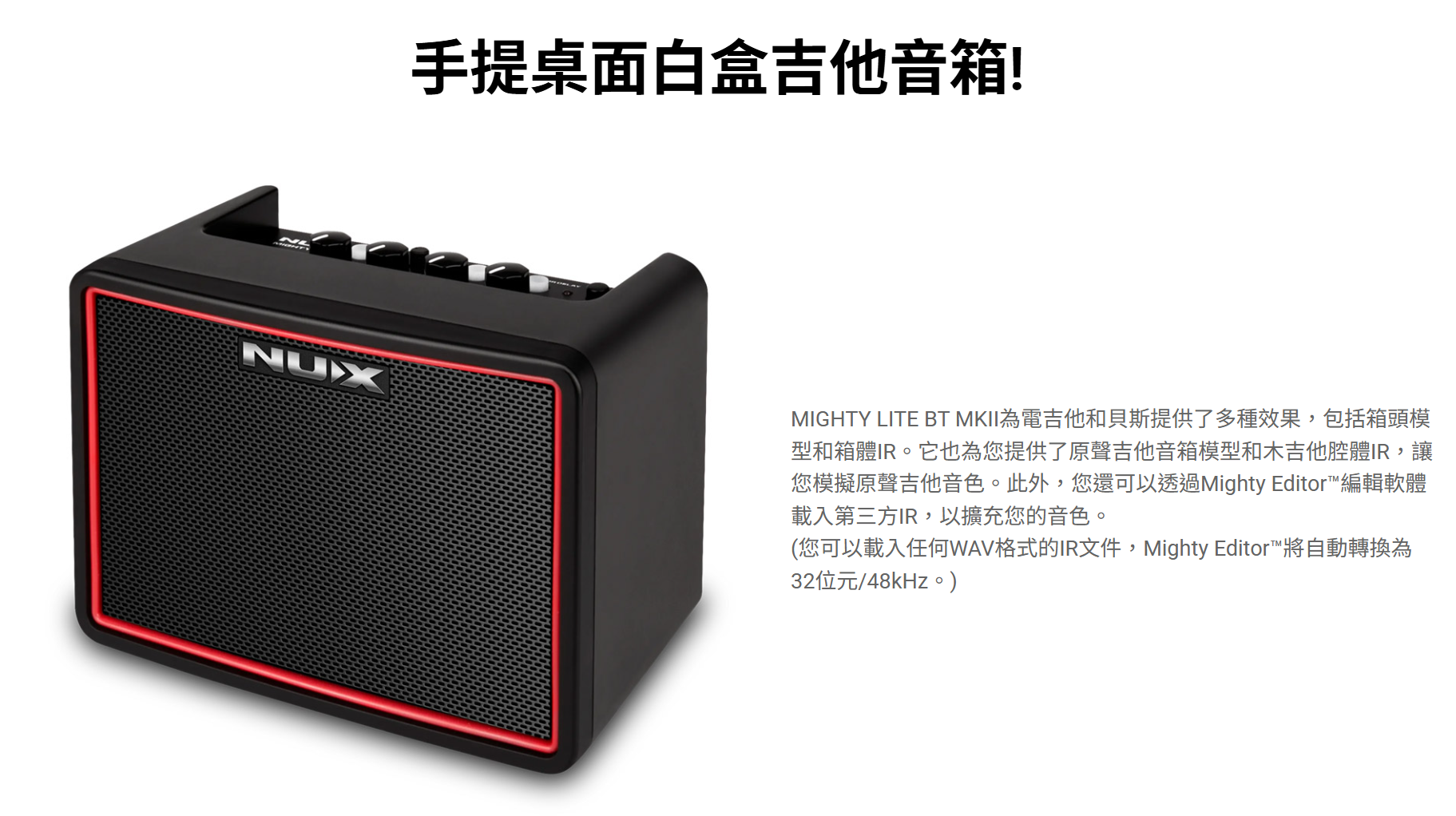 MIGHTY LITE BT MKII是一款便攜式mini吉他音箱。您可以在家中使用9V電源轉接器供電。也可以用6顆AA電池供電,將它帶到任何您想去的地方。