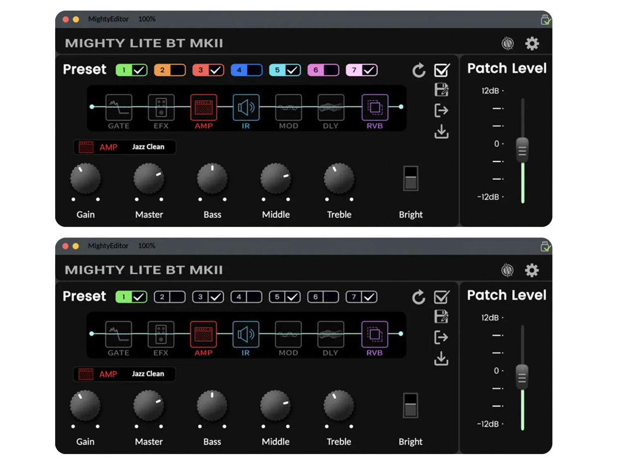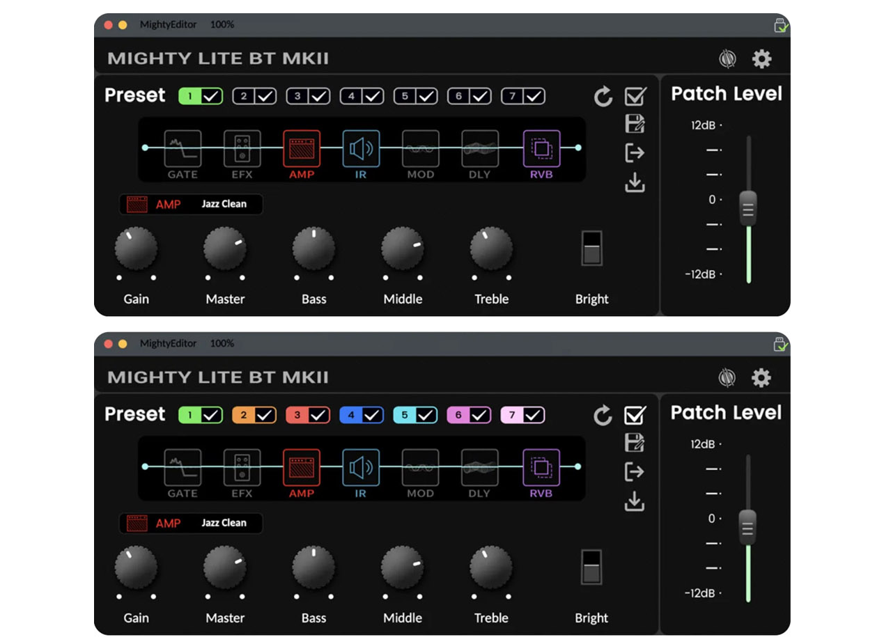 MightyAmp™行動端APP和Mighty Editor™電腦端編輯軟體可讓您調整所有訊號模組和參數。 MIGHTY LITE BT MKII包括GATE、EFX、AMP、IR、MOD、DLY和RVB訊號模組。除了內建的36個IR外,還有18個用於第三方IR載入的空位。 Mighty Editor™編輯軟體可以自動轉換您的IR到機器所需的取樣率,無需擔心配對問題。
