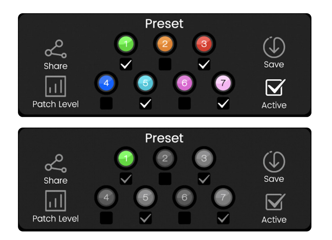 MightyAmp™應用程式範例:選擇預設1、3、5、7並按下活動圖標,當您按下預設開關時,裝置將知道將選擇預設1、3、5、7。