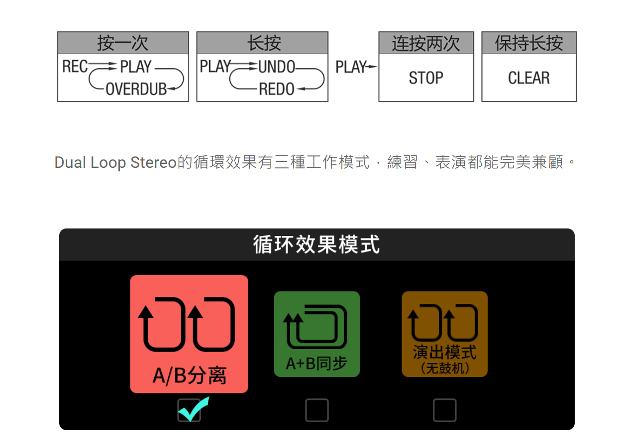 演出模式(無鼓機) : “演出模式(無鼓機) ” 非常適合您現場表演使用。在這個模式下,您可以沒有任何限制地使用兩個簡單的循環來幫助您唱歌或獨奏。