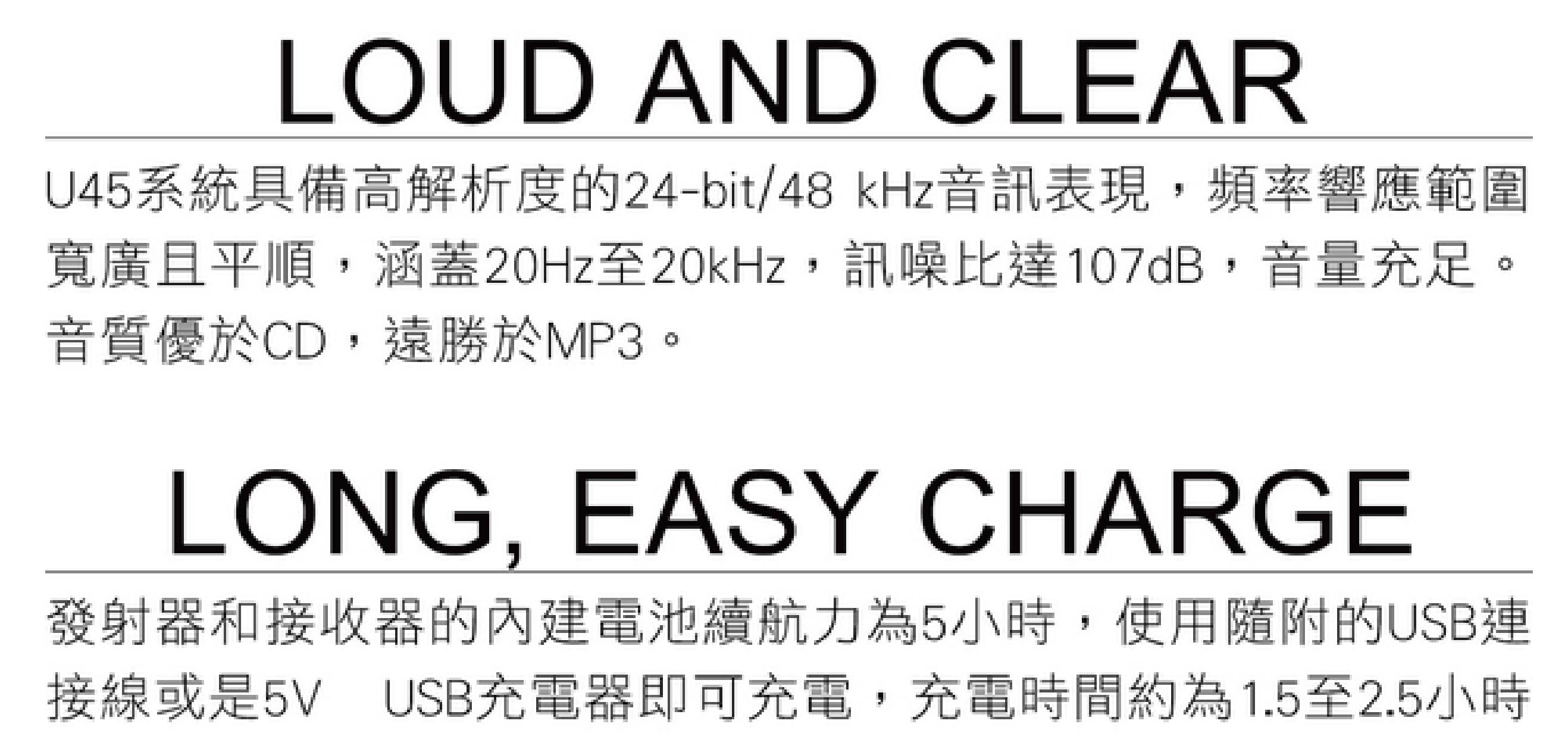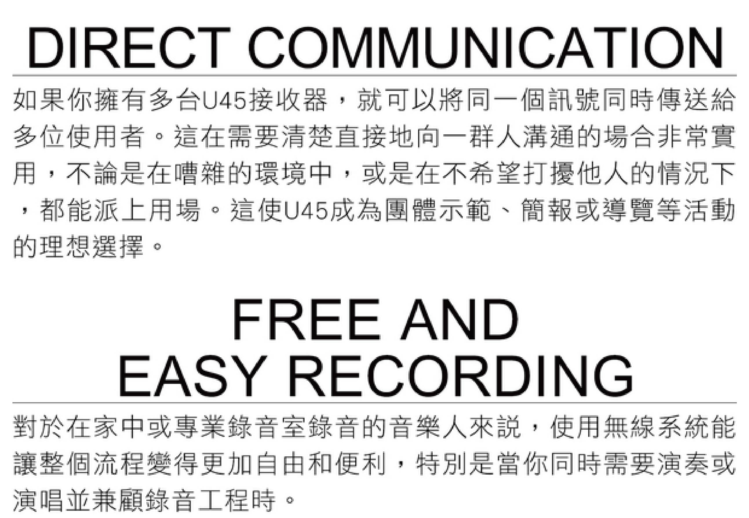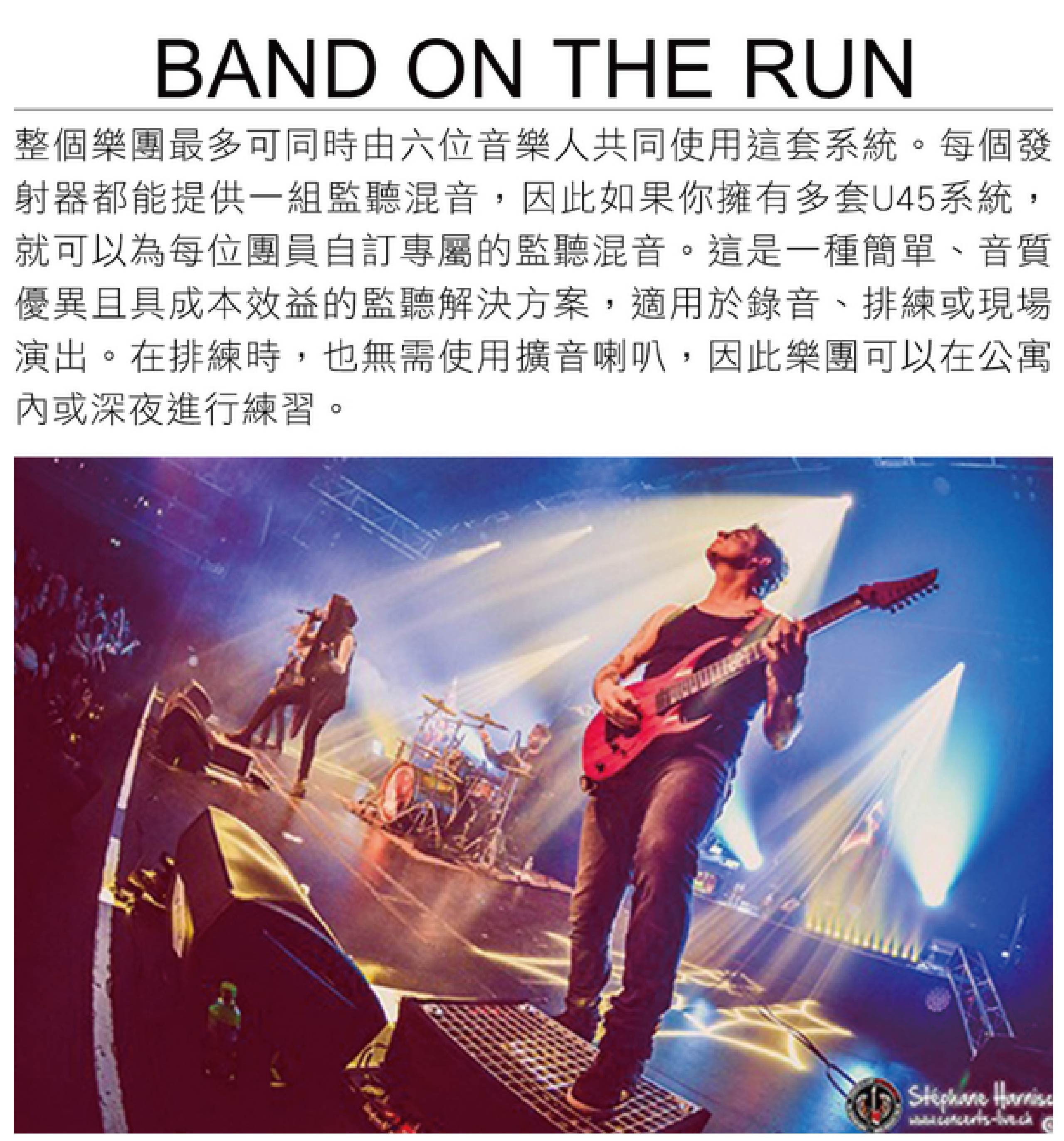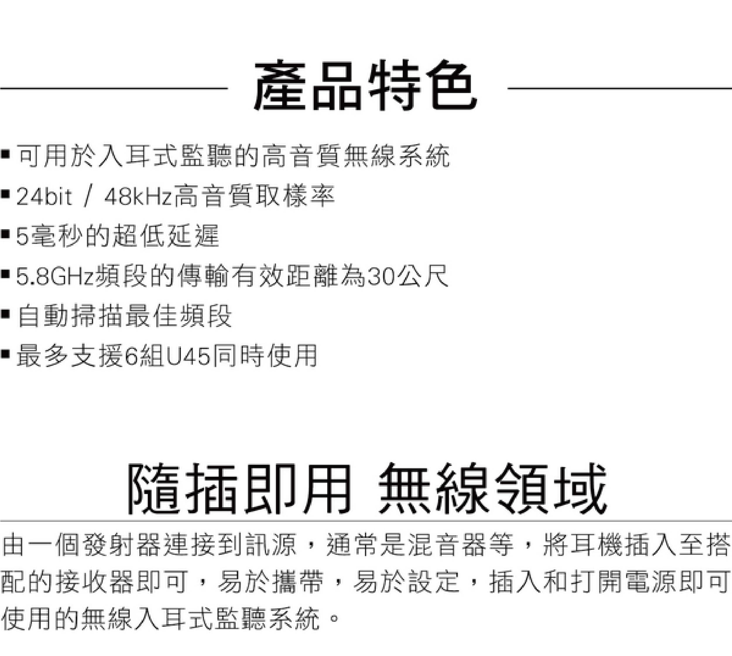● 最多可同時使用 6 組 U45 系統,團隊成員可各自擁有專屬耳機監聽